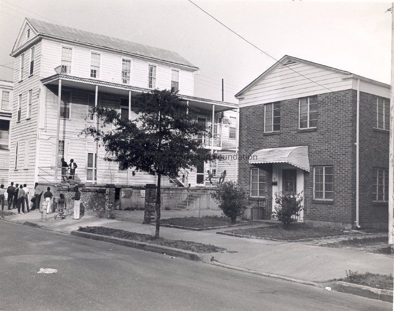 B&W photograph of 45 Laurens Street and 47 Laurens Street, street (front) elevation. Small group of people stand on sidewalk and porch of 45 Laurens Street.Collection