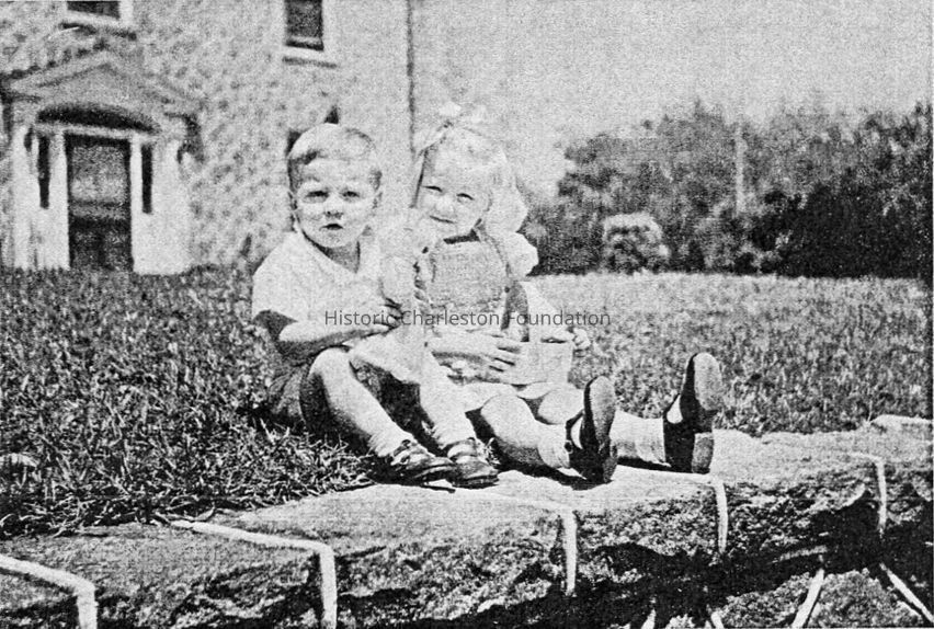 B&W photograph (scan) of a boy and girl seated on the lawn in front of 478 Huger Street.Collection