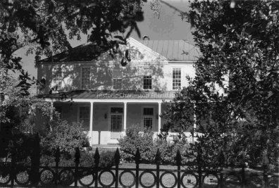 B&W photograph of 48 Bull Street (Emanuel Antonio House), front elevation. Top of iron gate in foreground.Collection