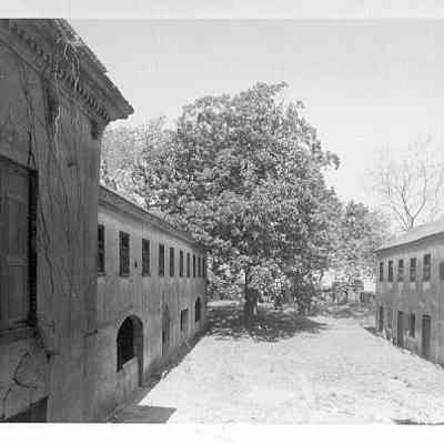 48) Courtyard looking N from N side entry; kitchen and laundry on right, carriage house and stable on left [pictured here]