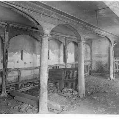 55) Carriage house and stable, ground floor, stable interior, W wall (note absence of column from arch in front of N wall door) [pictured here]