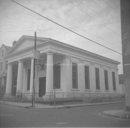 Constructed 1842; renovated 1913. Edward Brickell White, architect. This Greek Revival church was originally built for a congregation of German immigrants who broke away from the more Americanized St. John's Lutheran Church when it dropped its monthly service in German. The building was originally of exposed brick and lacked the Tuscan-columned front portico. It had an interior with a centered pulpit and communion table below. When St. Matthew's completed its grand new edifice in 1872 on Marion Square, the building was first sold to Salem Baptist Church but was conveyed within a decade to another evangelical Lutheran congregation, St. Johannes. A number of improvements, including the installation of the art glass windows, were completed in 1913.
