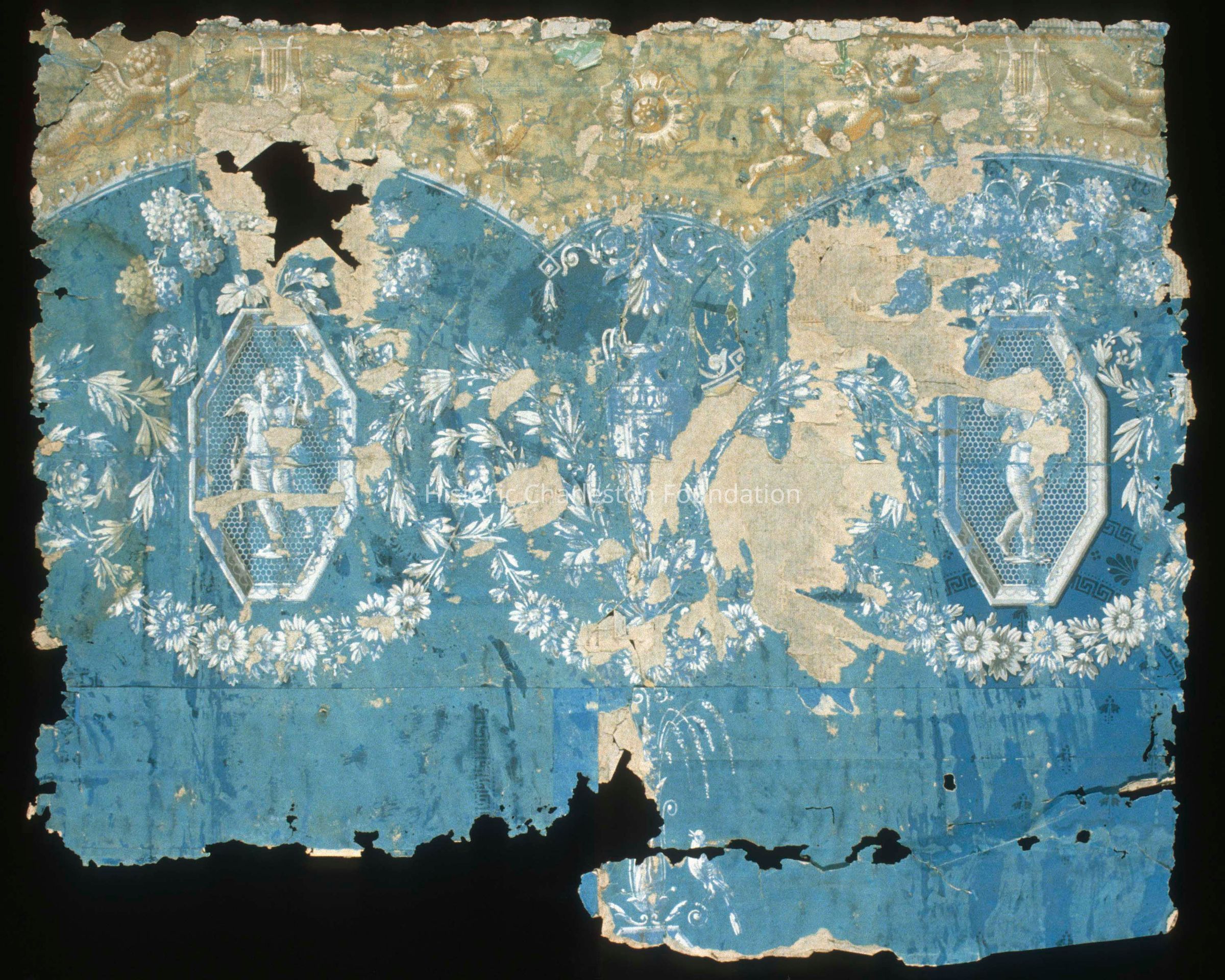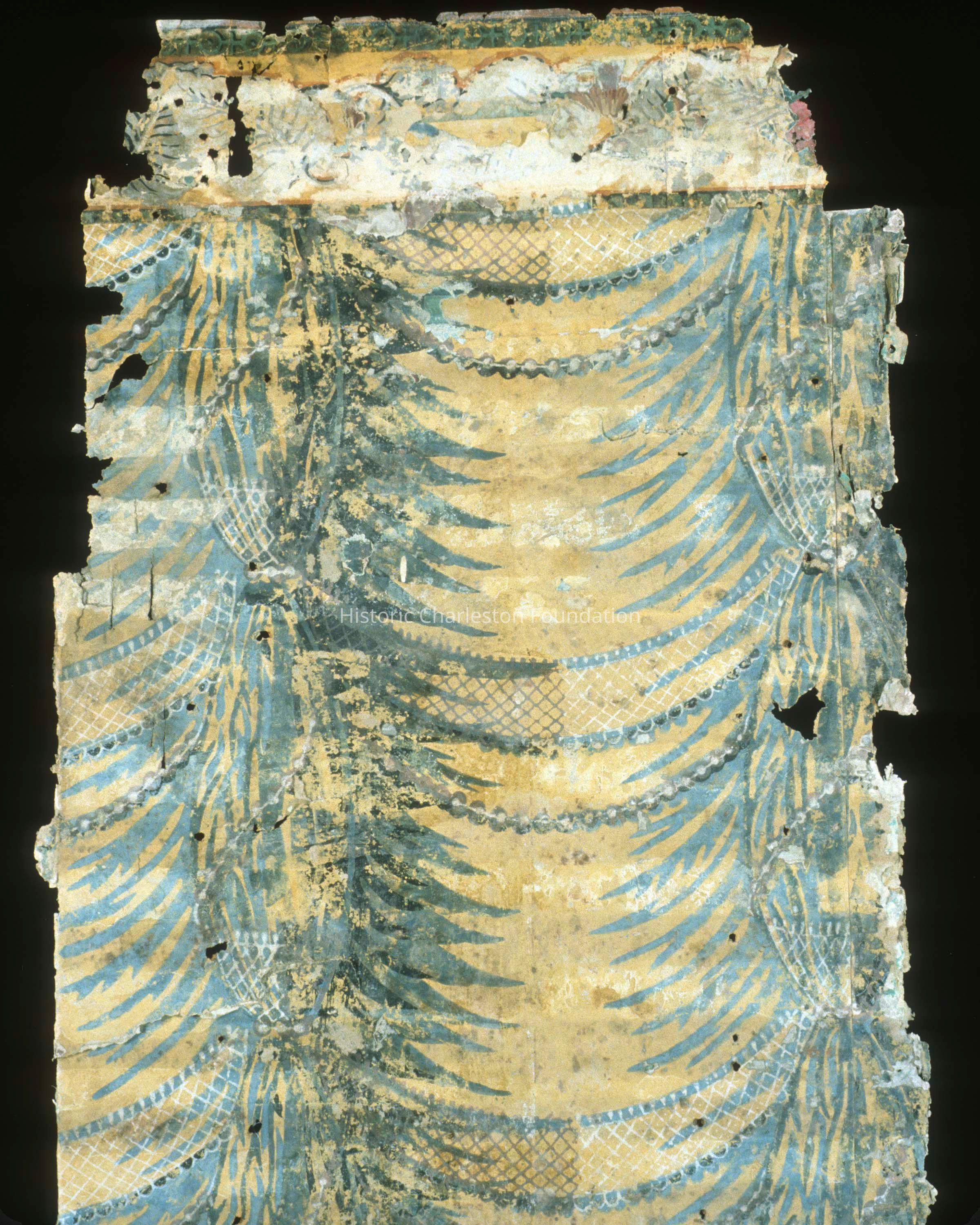 Thank you so much for helping with the wallpaper search! Attached are the two pieces that are believed to have been in the house - the wallpaper with the cobalt blue background (the first attachment) is part of the paper that Susan matched to the stairway and the paper with the swags may have come from the parlor. I will keep fingers crossed that Minh will have some thoughts about where these papers might be located. I truly appreciate your help with this rather strange situation - if you have any questions, please just let me know.