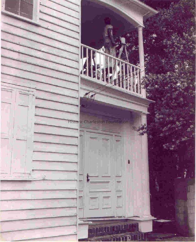 b: View of the door and second-story piazza. Piazza is being painted.
