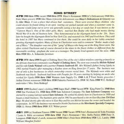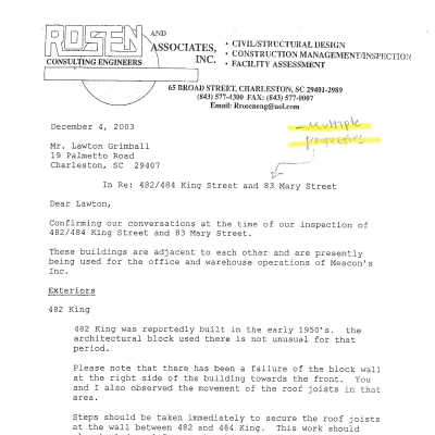 File contains Rosen and Associates (engineers) inspection report (2003) on 482 King Street and 484 King Street; newspaper article about possible demolition of 480 King Street (2013); list of 20th century residents from Old Codgers Charleston Address Book (see Media Tab).