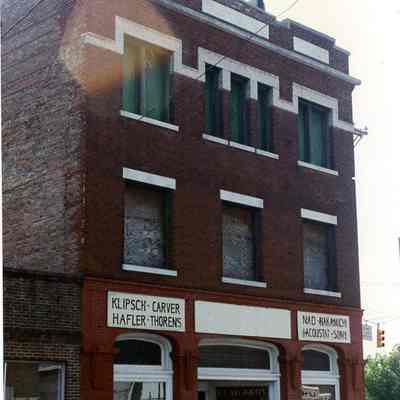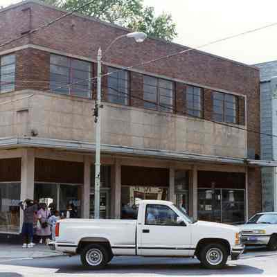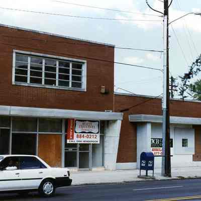 a: View south on King Street from Mary Street, showing the buildings on the west side of the street from 489-511 King Street. Features Shahid’s Department Store (491 King), Leon’s Men’s Wear (497 King), Gospel Records (499 King), Metropolitan Furniture Company (501 King), Honest John’s TV and Record Shop (509 King), and the edge of 511 King.