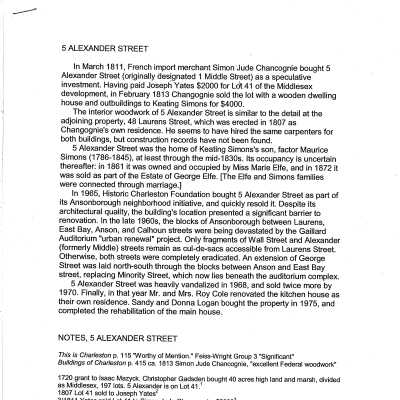 Simon Jude Chancognie constructed this comparatively large 3-story house in about 1813. The house retains excellent Federal woodwork on its interior (Poston, Buildings of Charleston). Alexander Street is a/k/a Middle Street.