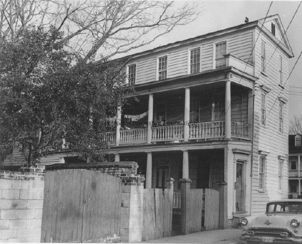 a: Street elevation, corner view, showing piazza side of house and fence. Car parked on street in front of house.