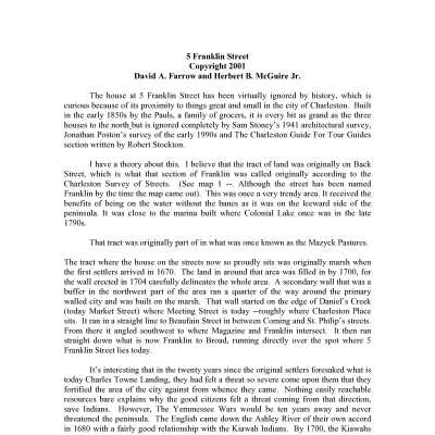 Constructed ca. 1880; alterations 1974, 2000, 2004. 5 Franklin Street is a 2½ story frame residence on a stuccoed masonry foundation, with a pedimented front-gable roof and a two-tier piazza along the south elevation. A very good example of Charleston vernacular architecture.