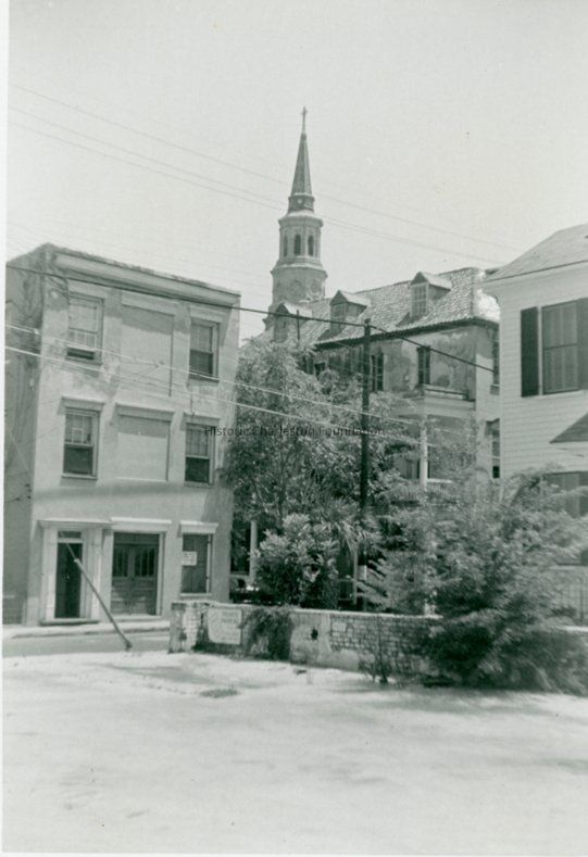 a: View of 50 Queen Street and the west elevation (piazza side) of 46 Queen Street, taken from across the street (possibly 47 Queen). St. Philip's Church in background.