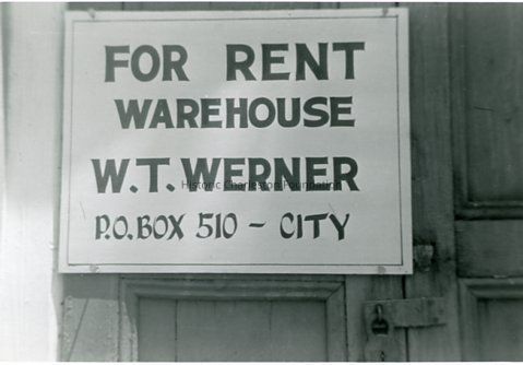 c: Sign on padlocked door: For Rent / Warehouse / W.T. Werner / P.O. Box 510 - City.Photograph Details