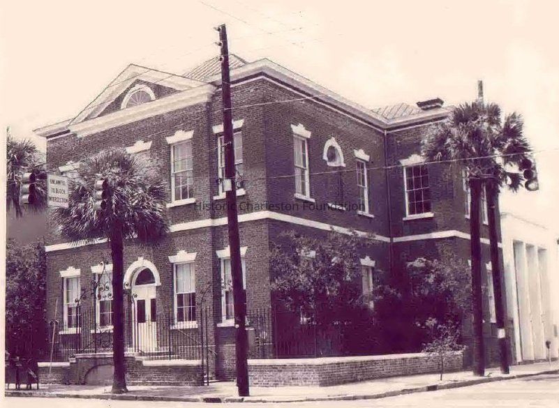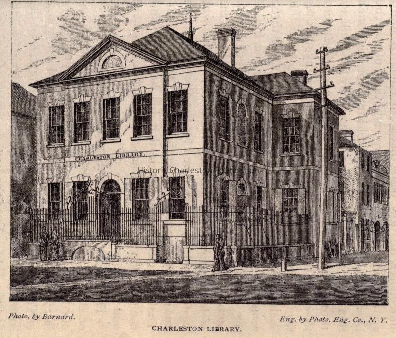 Constructed 1798; earthquake damage and changes, 1886; partially restored 1966. The Bank of South Carolina constructed this T-shaped building in 1797-98. A pedimented central pavilion projects from the front facade on the street, with the principal entry delineated by a white marble arch. Window lintels, voussoirs, and a belt course are also of white marble. The Bank of South Carolina sold the building to the Charleston Library Society, the nation's third-oldest institution of its kind, in 1836. The Library Society housed its collections here until its move to King Street in 1914, selling the building to the Chamber of Commerce. The structure was partially restored by a bank in the 1970s. (Poston, Buildings of Charleston.)