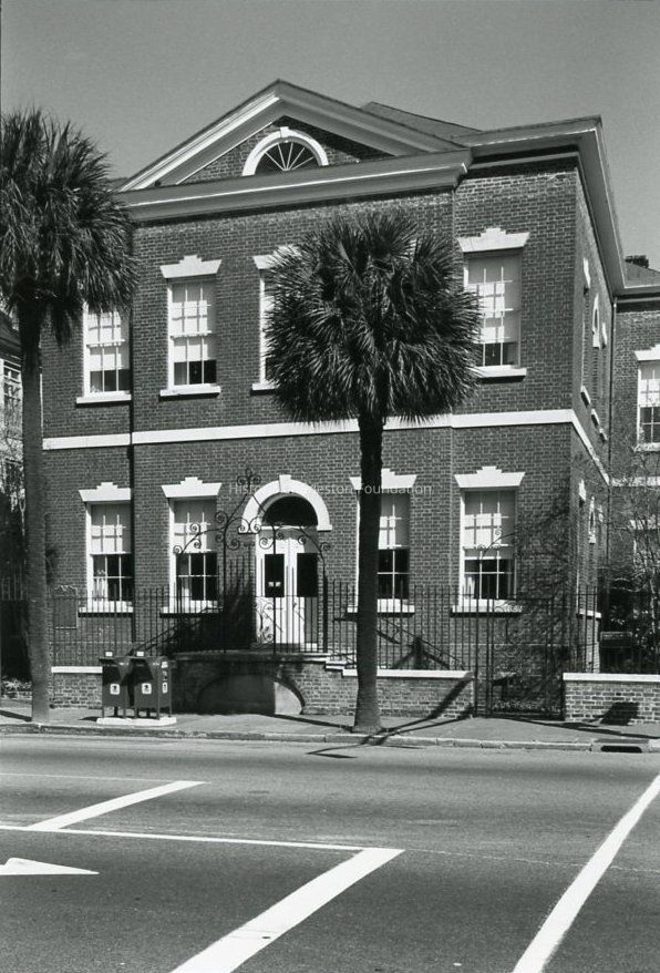 B&W photograph of 50 Broad Street (Bank of South Carolina), viewed from across the street, showing the south elevation with its pediment restored to its 1798 appearance.Collection