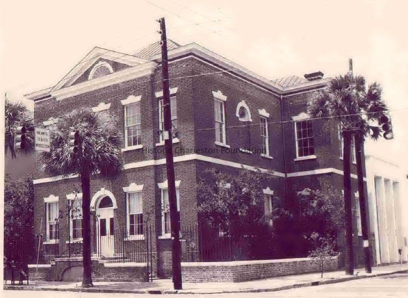 B&W photograph of 50 Broad Street (Bank of South Carolina), street elevation, view of southeast corner of the building and of the corner of Broad and Church Streets.Collection