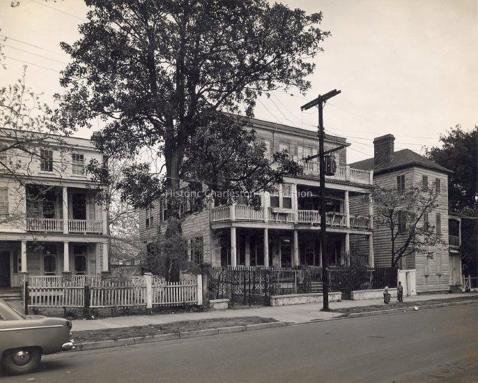 B&W photograph of the Adams-Ingraham House (50 Laurens Street), south (front) elevation. Neighboring houses on both sides also in view, 52 Laurens at left and 48 Laurens at right.