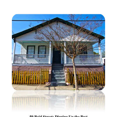 Constructed ca. 1919, 50 Reid street is a stud frame, bungalow siting on a raised foundation of stucco masonry. It is square in shape with one 10’x10’ protrusion on the east side of the north façade. On the south façade is a piazza covered by the cross-gabled roof. There is a center door with two 2/2 windows to the left of the door and two to the right, all evenly spaced. The east and west facades are identical with 4 2/2 windows spaced evenly across. The home features Italianate brackets in the eaves of the roof on the gables.
