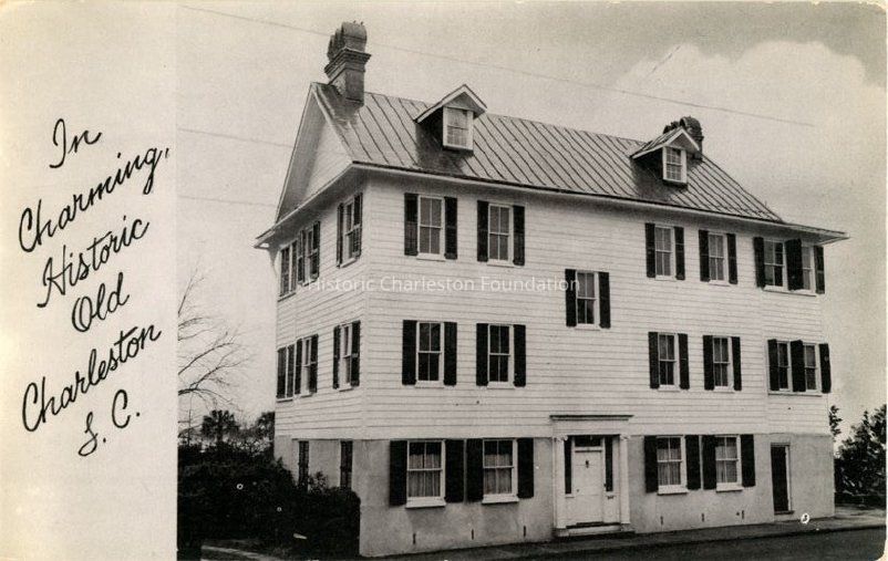 B&W photographic postcard of 51 South Battery. "In charming, historic old Charleston, S.C." printed at left. Caption on back: "Residence, Mr. and Mrs. James W. Wilkinson, 51 South Battery, Charleston, S.C. A West Indies type house built about 1795."Collection