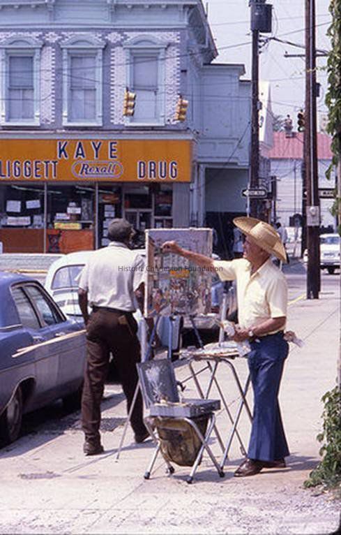 Color photograph (scan) of 515 King Street when it was the Kaye Liggett Rexall drug store. Street (front) elevation. Artist (Horace Day) in foreground painting a likeness of the building.Collection