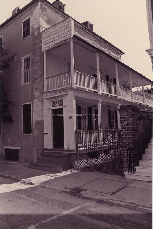 B&W photograph of 52 Church Street (Charleston Port Society), street (front) elevation, showing the southwest corner and piazzas. Photographed as part of "Historic Charleston Foundation's Endangered Structures Report" (see P156).Collection