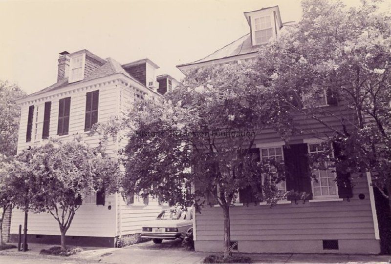 B&W photograph of 52 King Street (Edgar Wells House), west (front) elevation. View partially obscured by trees. 50 King Street (John Cowan House) at left.Collection