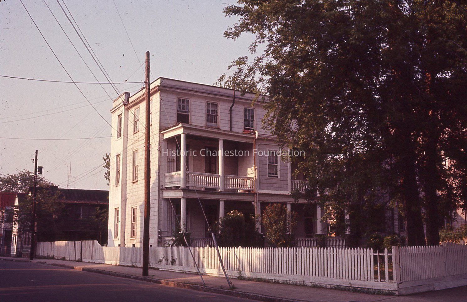Ektachrome color slide of 52 Laurens Street, located at the corner of Laurens and Wall Streets. Corner view showing the south (piazzas) elevation and the west (Wall Street) elevations. White picket fence surrounds the property.Photograph Details