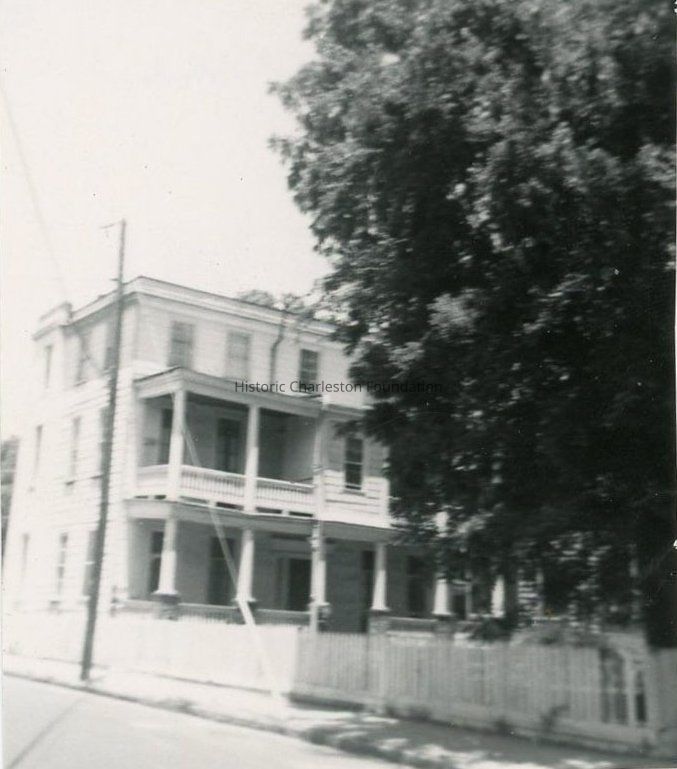 B&W photograph of 52 Laurens Street, located at the corner of Laurens and Wall Streets. Corner view showing the south (piazzas) elevation and the west (Wall Street) elevations. White picket runs in front of the property.