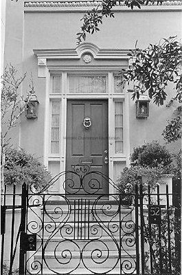 B&W photograph of the doorway of 52 Smith Street (Robertson-Pickens House). Iron gate in foreground.Collection