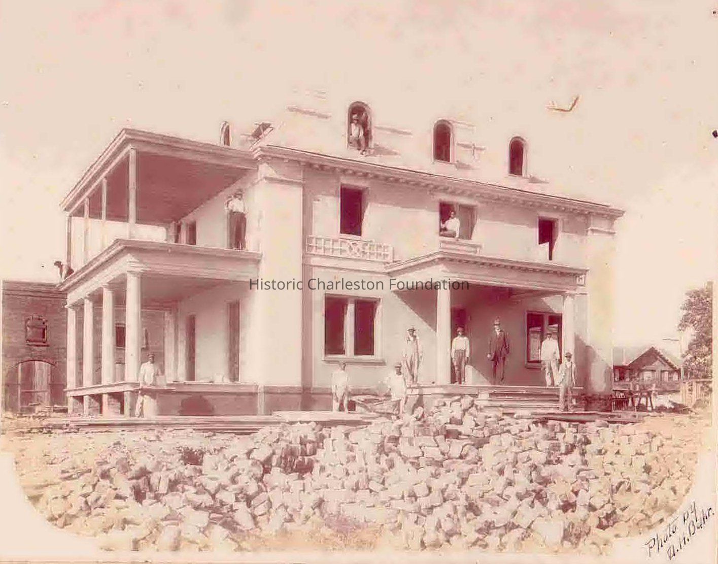 There is no evidence of 55 Ashley Avenue (next door), which was constructed in 1912, so this photo dates prior to 1912. Brick building behind and visible on the left as is a house in the background on its right (perhaps on Beaufain Street).Collection