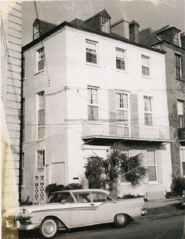 B&W photograph of the Charleston Club (53 East Bay Street), front (east) elevation and view of southeast corner. Car parked in front.Collection