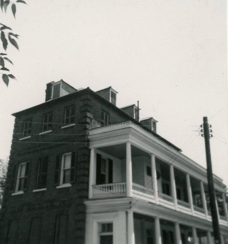 B&W photograph of 53 Laurens Street, corner view showing the north (front) and west (piazzas) elevations. Lower half of the first story cut off in photo.