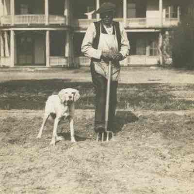 e: Gardener and dog standing in backyard. Rear piazzas in background. "Whitney - dog and J.D.A. [Joseph D. Aiken] home, Charleston, S.C." handwritten on back of photo.