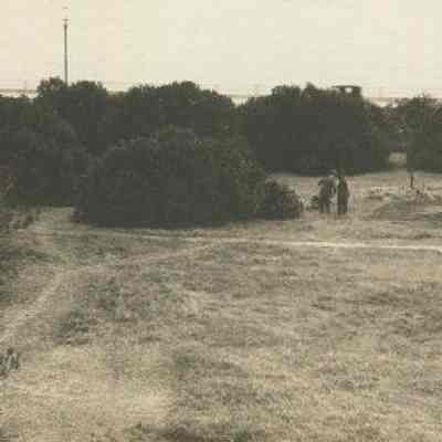 f: Section of land, presumably the backyards, and the view of bushes. Two gardeners at work. Car on Murray Boulevard and the Ashley River in background. "J.D.A. [Joseph D. Aiken] - Look at them are oleanders many colors some as many as 5 rows petals - Ashley River from rear" handwritten on back of photo.Collection