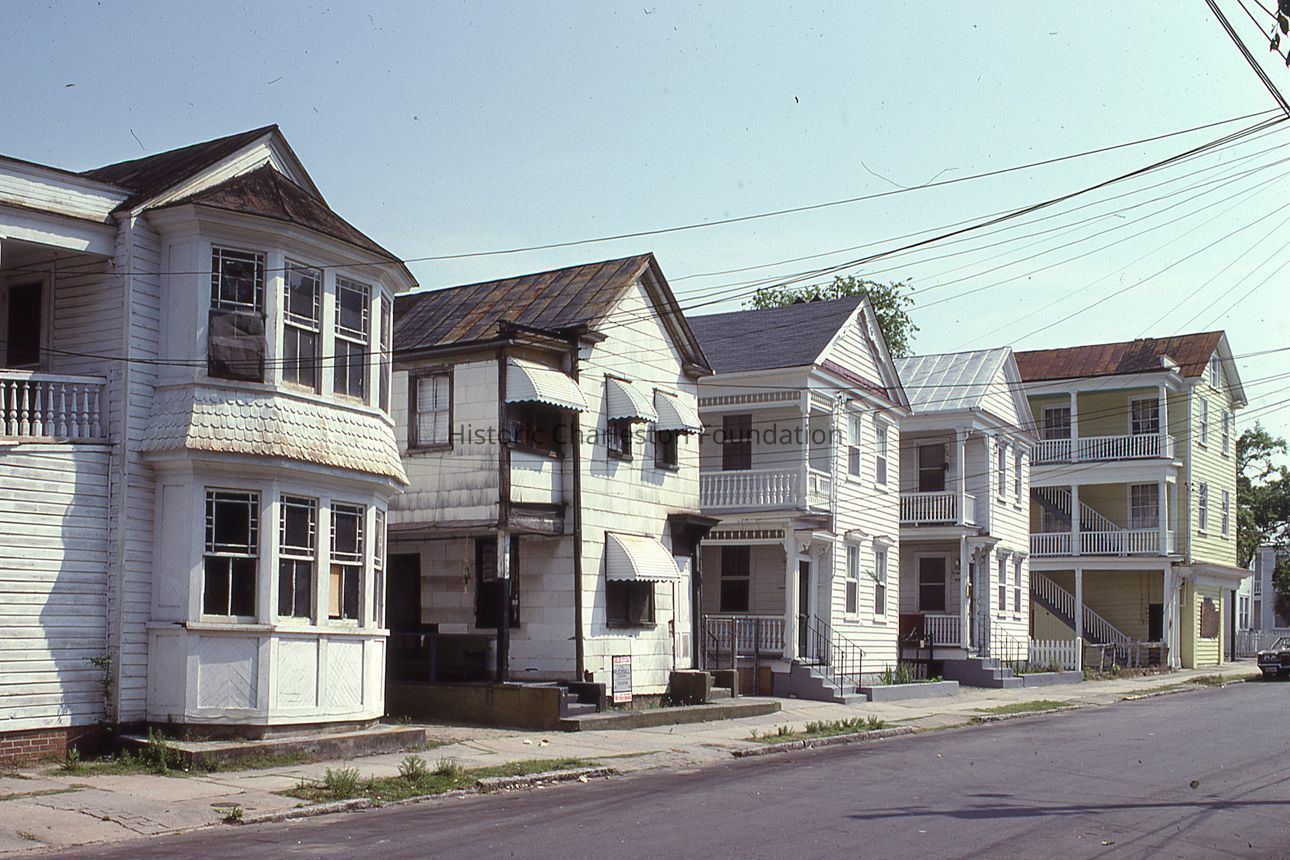 Color Kodachrome slide of Warren Street houses from 54-62. Left to right: 62 Warren, 60 Warren, 58 Warren, 56 Warren, and 54 Warren. The house at 54 Warren was demolished; two new houses were constructed on the site.