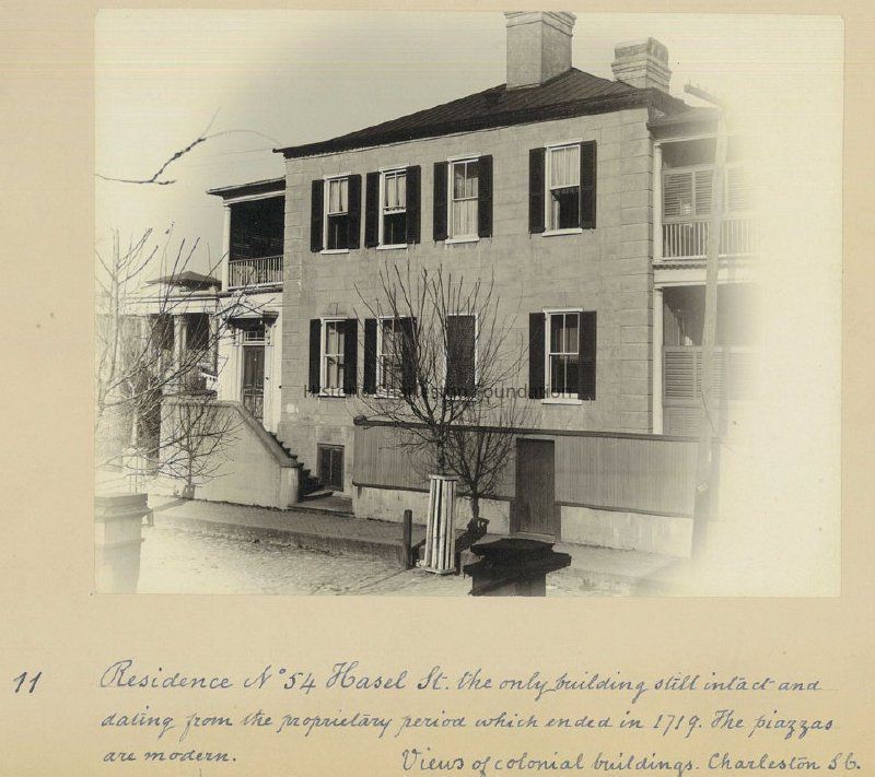 #11 Residence No. 54 Hasel (sic) St. the only building still intact and dating from the proprietary period which ended in 1719. The piazzas are modern. Views of colonial buildings. Charleston SC.Type
