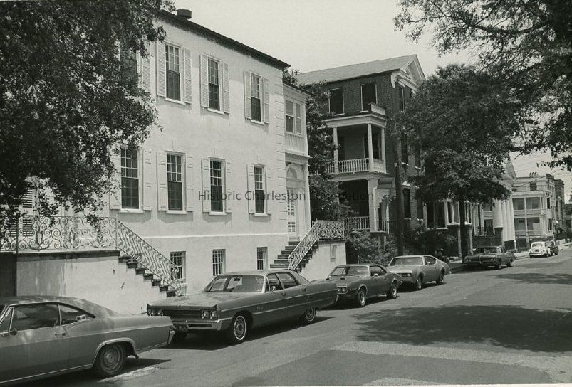B&W photograph of the view looking east on Hasell Street from 54 Hasell Street (Col. William Rhett House) to 42 Hasell Street. Several cars parked on the street.Collection