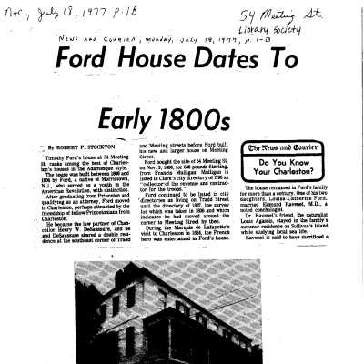 Three files contain documentation of the easement on the property (donated in 1992 and 2005) including related correspondence and Confirmation of Understanding; Part I certification (National Register); IRS form 8283; annual inspection report (1996); FOHG house histories (1949?, two undated [1980s?], 1993); FOHG garden history (2004); newspaper articles (including 1977 DYKYC); house history from Information for Guides of Historic Charleston; handwritten genealogical notes [scant] about Timothy Ford; photocopies of deeds/titles (1830, 1833, 1835, 1842, 1910, 1937); copy of 1964 plat; Zoning Board approval to subvidivide lot and build additions; photos of garden from Charleston Gardens by Loutrel Briggs.