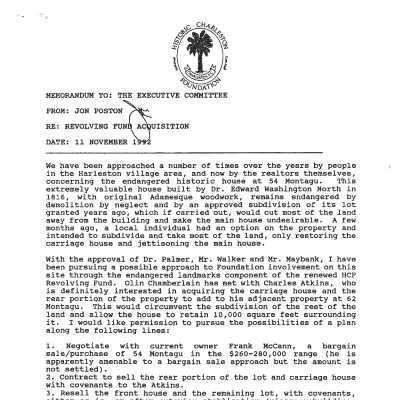 Three files contain documentation of the covenant on the property; annual inspection letters and reports; requests for alterations; correspondence and other documentation related to the sale and management of the property; documentation of HCF's purchase of the property; historical/chain-of-title research information, including list of "Negroes" (compiled by HCF staff?), will, and inventories of Edward North Washington; FOHG house histories (1994, 2004); FOHG garden histories (1997, 2007); narrative history from Charleston's Federal Architecture (1994); house history from Vernacular Architecture of Charleston and the Lowcountry; realtor's illustrated house history; newspaper articles (including undated and 1972 DYKYC); magazine article (Traditional Home, 2003); application for 1997 Great American Homes Award (denied); measured drawings (first and second floors); plat of 54 and 56 Montagu Street (1994); photocopies of elevation and interior detail photographs by Preservation Consultants (1983); captioned photograph of iron work (1937 pictorial exhibit, N&C).
