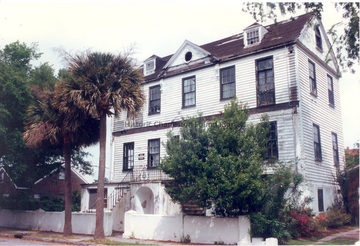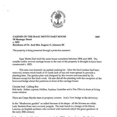 Constructed ca. 1806; porches added 1820s, back porch enclosed and second story added 1840s-50s; restored with new addition 1994-95. In 1795 eleven lots on the estate of the late John Harleston were divided among his three surviving daughters. On July 21, 1801, Isaac Motte Dart, a Charleston attorney and factor, purchased the two halves of one lot, although he is listed as residing on Hasell Street until 1806. Dart built the typical Charleston single house now known as 54 Montagu between 1806 and 1809. It is uncertain when Edward Washington North, a Charleston physician, purchased the house, but Dart disappears from the directories by 1824 and North is listed on Montagu by 1829. It is possible that North added the large rear addition, which dated to the 1820s, and built the surviving dependency. North was elected mayor of Charleston in 1833 and served until 1835. In 1845, North sold the house and land to Ann Simons, wife of Sedgewick Simons. This 2½ story wooden building on a raised basement has a front staircase or portico, and is reminiscent of plantation construction. Nineteenth century changes including the large rear (northern) addition, removed after Hurricane Hugo. Also of note is its early Gothic Revival carriage house at the rear of the property. The main building was purchased by the American Missionary Association in 1930 and retained by the organization until the 1950. The property was then used by a local nursing school as a dormitory. (Poston, Buildings of Charleston.)