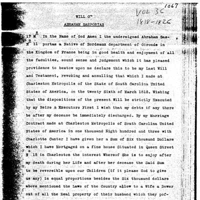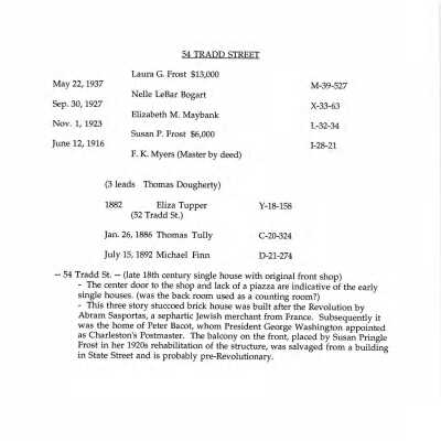 Three files contain documentation of the easement on the property including related correspondence and Confirmation of Understanding; Part I certification (National Register); correspondence related to the sale of the property; annual inspection reports; requests for alteration; correspondence related to the management of the property; FOHG house histories (two 1960s?, 2001, 2007); house history from Vernacular Architecture of Charleston & the Lowcountry; house history (Samuel Gaillard Stoney, 1958); house history from Information for Guides of Historic Charleston (1984); newspaper article; captioned newspaper photograph (1937 Charleston Pictorial Exhibit); historical/chain-of-title research information, including photocopy of will of Abraham Sasportas, plat, map, and deeds; copies of HABS photos; graduate student research project: chain-of-title, documentation of the enslaved, documentation of outbuilding(s) (Short, 2020); measured floor plan; photocopies of HABS photographs.