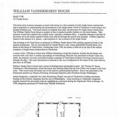 Constructed 1740; restored 1930s, 1996. This 3-story masonry structure covered with stucco is a fine example of early single house construction and is important in understanding the development of the single house. The house retains its original floor plan, the prototype for single house construction. The William Vanderhorst House is notable in that it retains its public entrance on the street facade. The dwelling at 54 Tradd Street is attributed to William "Vander Horst." The lot was inherited by Vanderhorst's wife, whose grandfather owned nearly two-thirds of this block of Tradd Street. Constructed circa 1740, the house is believed to be one of the earliest examples of single house construction in Charleston. A study of the plat in 1796, at which time William Robertson owned the property, reveals that the house was covered with a tile roof. A modest assemblage of outbuildings filled the rear yard back to Rope's Alley (now Ropemaker's Lane), but, oddly, the property was only accessible through a passage to Tradd Street instead of having a second access through the alley. The early introduction of piazzas to the city is evidenced on the house of Mr. John McIver next door at 56 Tradd. William Vanderhorst's house had a series of distinguished and notable tenants. Thomas W. Bacot, Charleston's fifth postmaster, rented the house, and tradition holds that the post office was located in the front room. (Poston, Buildings of Charleston.)