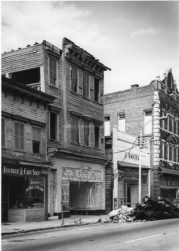 B&W photograph of 543 King Street (Leon's Boutique), 545 King Street (Casual), 547 King Street (J. Needle [clothing store], and 549 King Street (Leon's Five Cents-Ten Cents and One Dollar Store), showing the damage done by Hurricane Hugo.