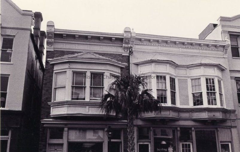 The complementary two-story masonry buildings at 55 Broad Street and 57 Broad Street were constructed in 1907 by brokers T.K. and Alex Marshall. The second floor of the eastern structure is fenestrated with a large bay window, while the matching floor of the western structure has a pair of bay windows. (Buildings of Charleston.)Collection