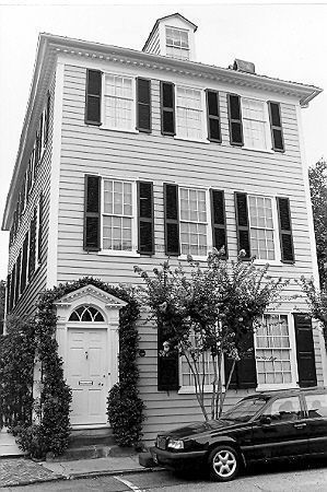 Constructed ca. 1818; converted to apartments ca. 1952; restored to residence 1987. This is a 3½ story weatherboarded frame house built by a Charleston merchant in the late-Neoclassical style on the site of the 18th century townhouse of an Ashley River planter. It is notable for its unusual plan, which is an early divergence from the Charleston single house. The arched and fanlighted front door leads to a side passage which provides access to a front room, probably originally for business, and thence to the rest of the building with its residential spaces. Although passing through a succession of prominent resident owners including the physician and scientist Dr. Thomas Y. Simons from 1835-47, the building became a boardinghouse and then apartments before a recent restoration. The garden at the rear has received acclaim as modern interpretation of the classic town garden of 18th century Charleston. (Poston, Buildings of Charleston.)