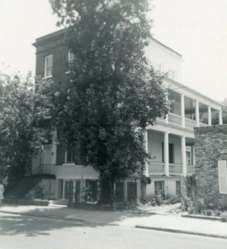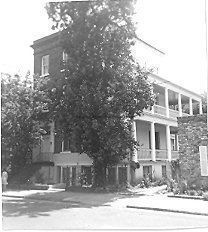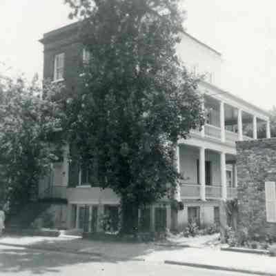 B&W photograph of 55 Hasell Street, corner view of the house showing the north (front) and west (piazzas) elevations. View is partially obscured by trees.
