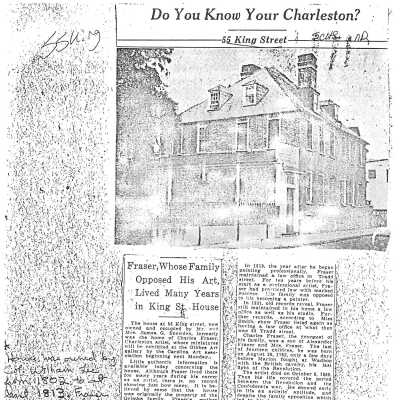 Constructed ca. 1762. Originally built as a double tenement by the jeweler Frederick Grimké, this property was inherited in the late-18th century by his grandson, Charles Fraser. Fraser, Charleston's most noted early miniaturist, painted likenesses of more than 500 of Charleston's elite during his long career. The 2½-story Flemish bonded brick dwelling was converted to a single family residence in the mid-20th century, but a fire wall is still visible through the slate hipped roof. (Poston, Buildings of Charleston.)