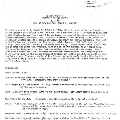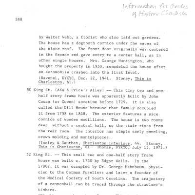 File contains FOHG house histories (1974, 1995); other narrative histories; newspaper articles (including undated DYKYC); house history from Information for Guides of Historic Charleston.Collection