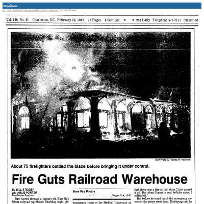 Constructed ca. 1890s, this old railway freight station running along the eastern side of East Bay Street (552-556 East Bay Street) served many purposes, and ultimately ended up as a huge flea market building. It housed a restaurant, numerous gift booths, and the Atlantic Brokerage Company when it burned to the ground in February, 1988. (Old Codgers Charleston Address Book.)