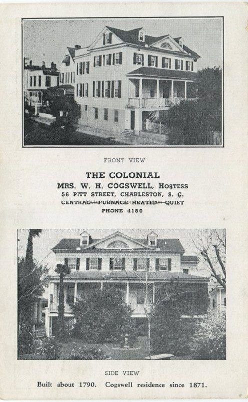Captioned: "The Colonial, Mrs. W.H. Cogswell, Hostess, 56 Pitt Street, Charleston, S.C. Central - Furnace Heated - Quiet. Phone 4180."