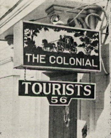 On verso is a small photograph of the sign: "The Colonial - Tourists - 56."
