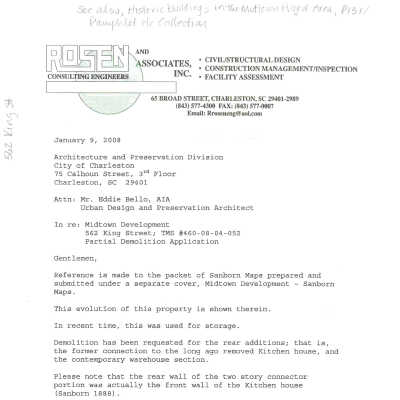 File contains 2008 engineer's (Rosen and Associates) report (with Sanborn maps) in reference to a request for partial demolition; occupancy history from Old Codgers' Charleston Address Book.